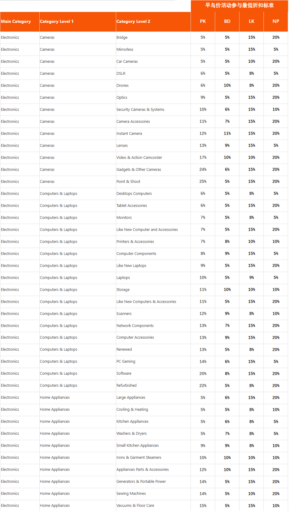 依据国家和品类的不同,将适用不同的折扣规定。表内列出了规定的最低折扣参与早鸟的产品折扣需大于等于折扣要求。