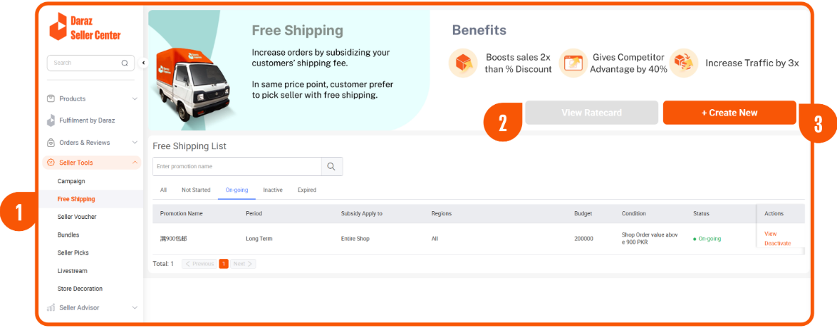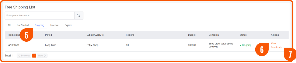 5. 点击 On-going 查看已激活上线的免邮活动;