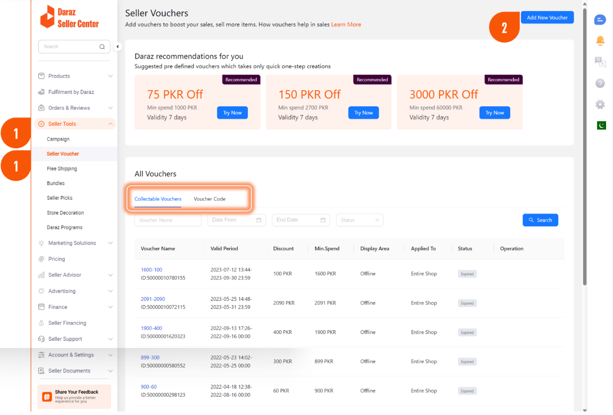 卖家中心左侧导航栏Seller Tools > 下拉 点击Seller Voucher 进入优惠券页面,