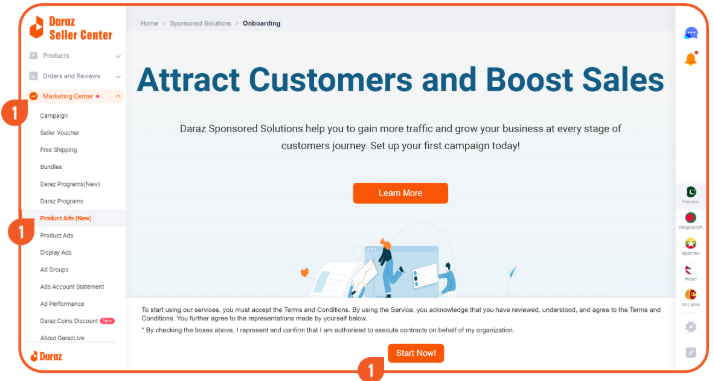 主视图跳转页面,如第一次登录此页面显示右图页面,点击 Strat Now! 开启搜索广告功能。