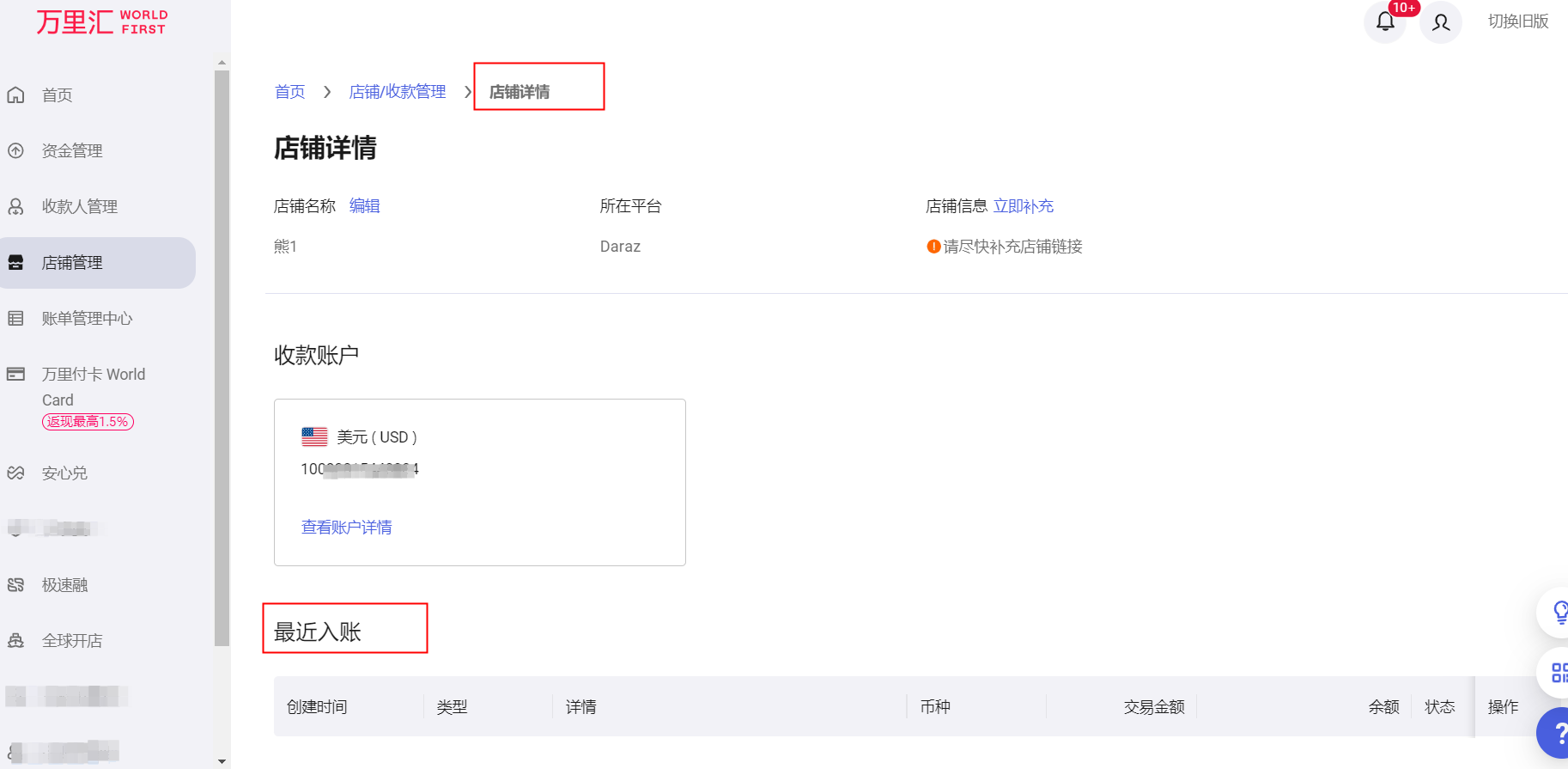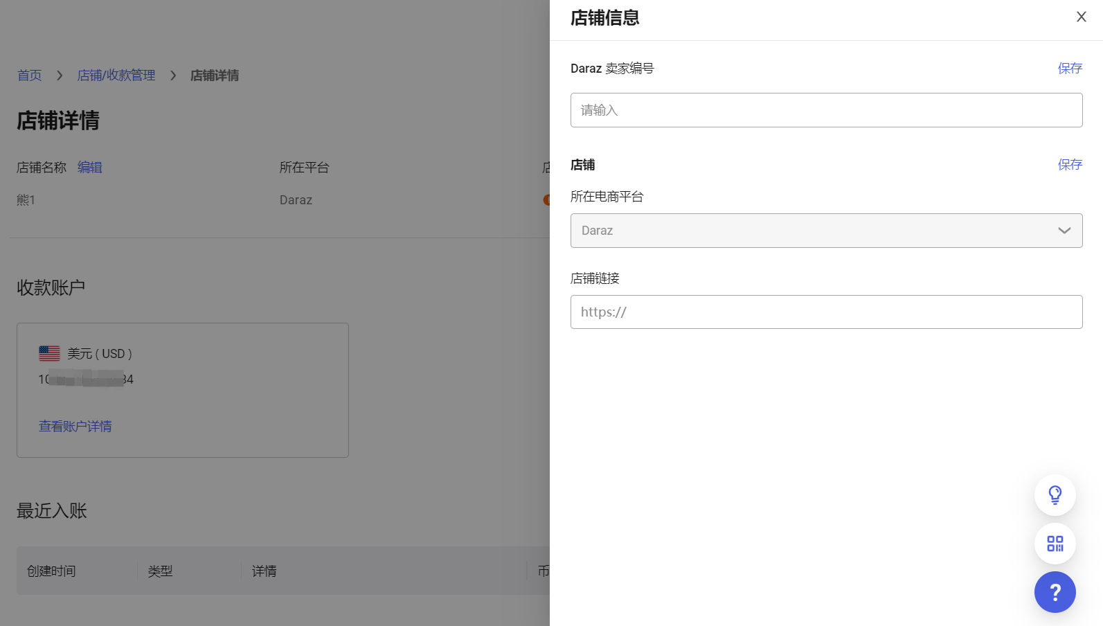 - 点击对应店铺的【详情】后您可查看对应的店铺名称、收款账户详情以及店铺的最近入账订单;