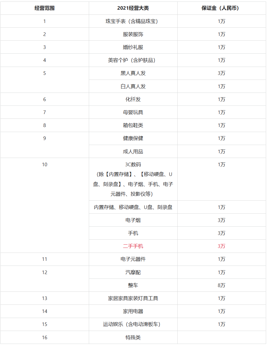 2、保证金按店铺入驻的经营大类收取,如果店铺入驻多个经营大类(仅涉及9和10经营范围下),则保证金为多个经营大类中的最高金额。