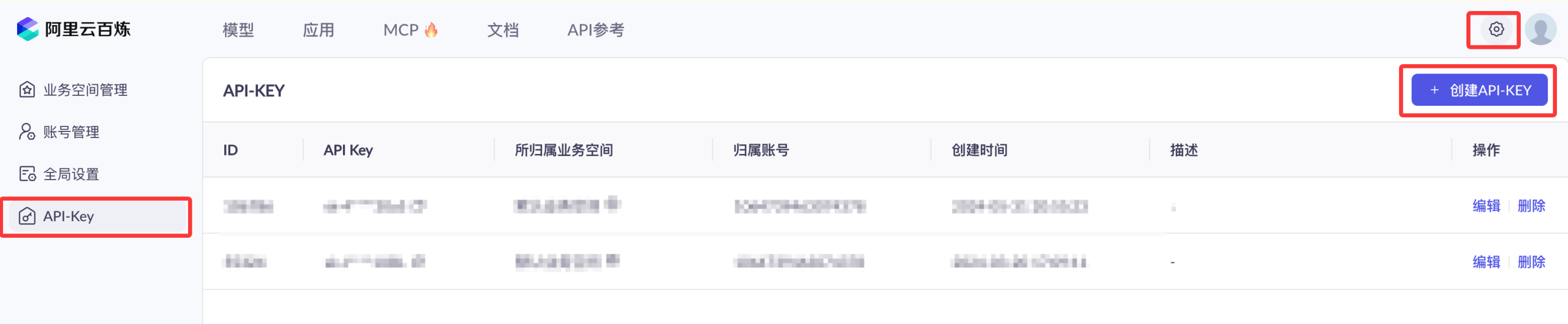 我们可以先使用阿里云主账号访问百炼模型服务平台:https://bailian.console.aliyun.com/,然后点击右上角登录,登录成功后点击右上角的齿轮⚙️图标,选择 API key,然后复制 API key,如果没有也可以创建 API key: