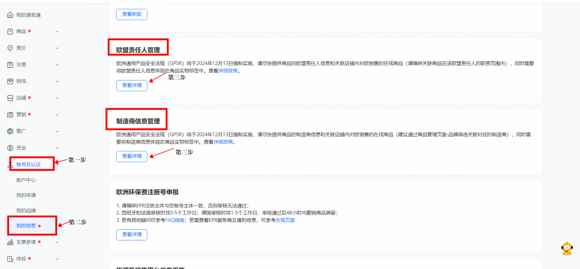 自营运商家:商家后台-账号及认证-我的信息-欧盟责任人管理/制造商信息管理
