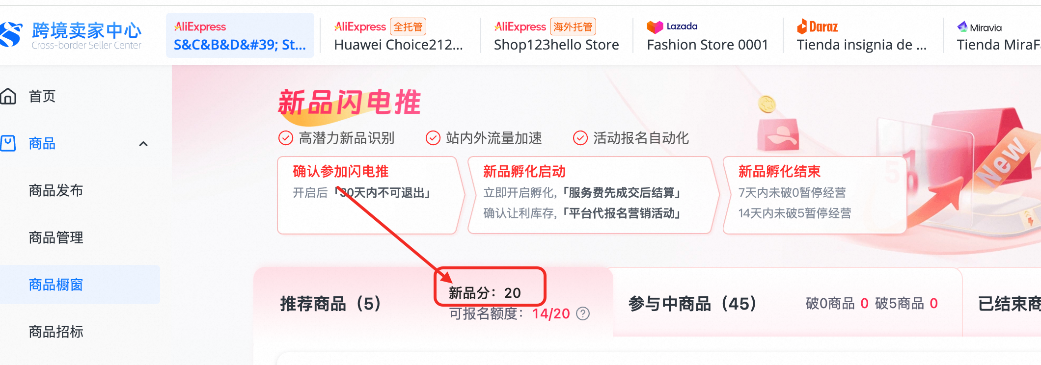 商家后台"新品分"展示(注:新品分时据新品成交指标得分/指标权重计算,分国家分值不一致时以最高分计算。