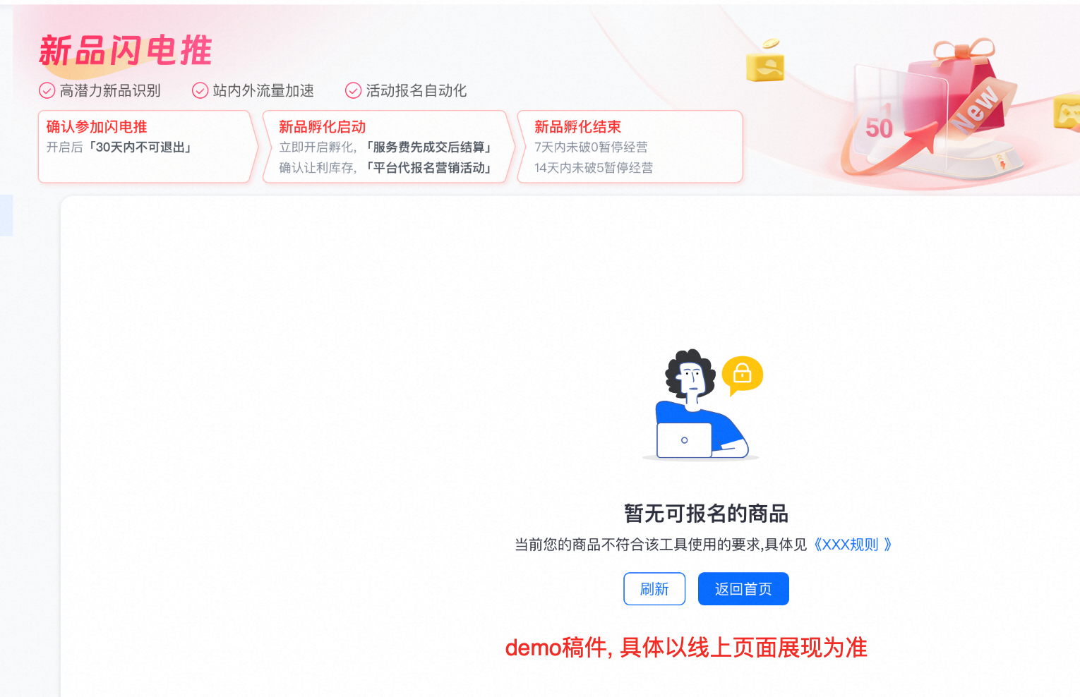 近30天新发商品,且商品综合竞争力在同行业中排名靠前,具体请以后台【审核状态】为准。库存要求至少5件,满足分阶段营销活动(早鸟/SD)基础门槛,如无商品符合要求展示如下,具体以产品页面展现为准。