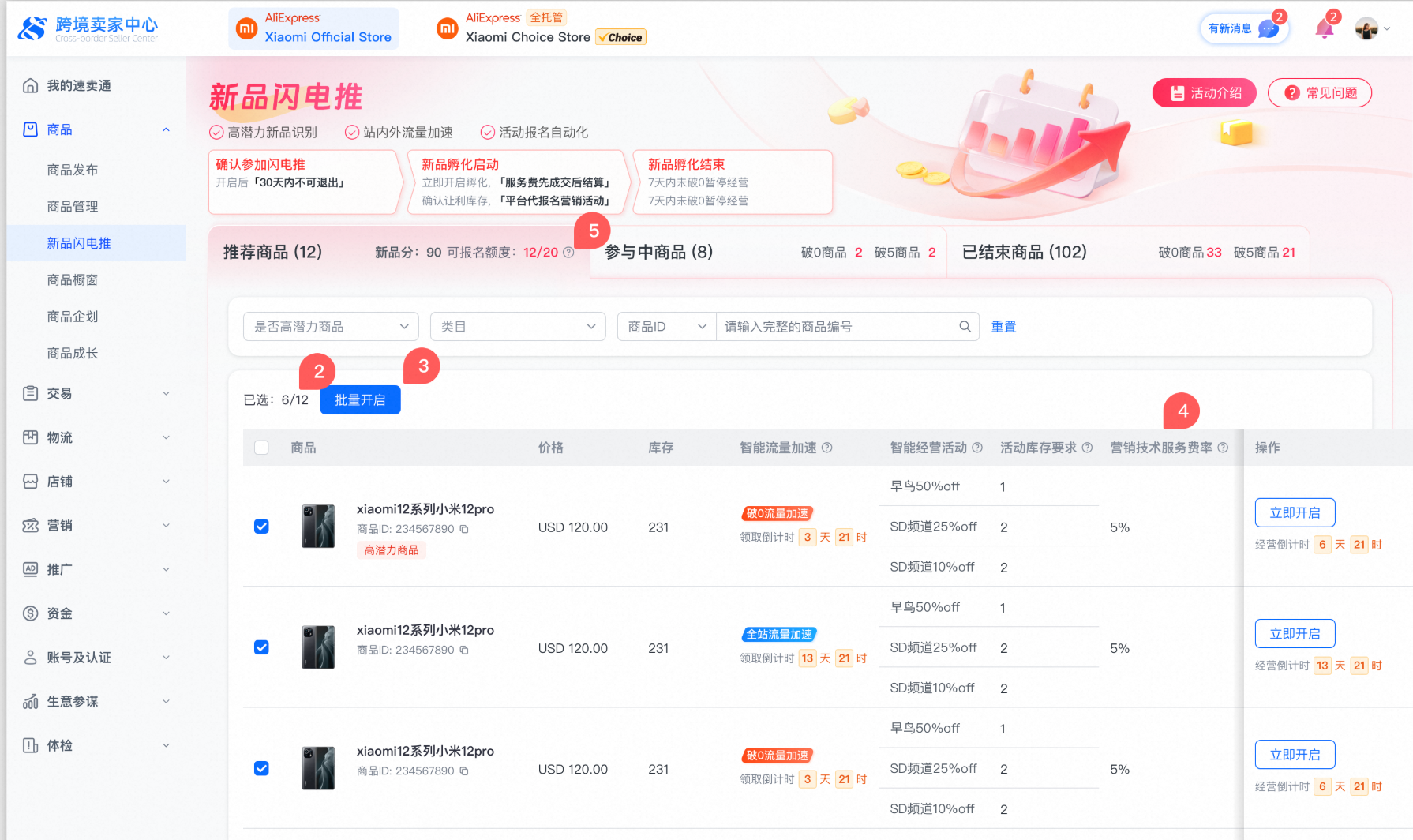 新品上架近30天内,商家只要点击一键授权,满足不同阶段单量新品可一健报名营销活动,商家只需要准备好让利库存,具体以产品页面提示为准。