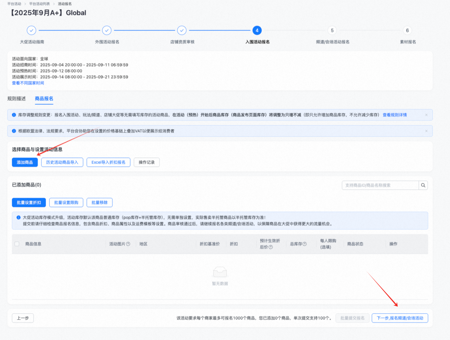 入围活动:请先找到该大促的外围活动,点击就下一步可进入入围活动,在④「入围活动报名」环节(如下图),切换到「商品报名」tab下,可操作退出活动。