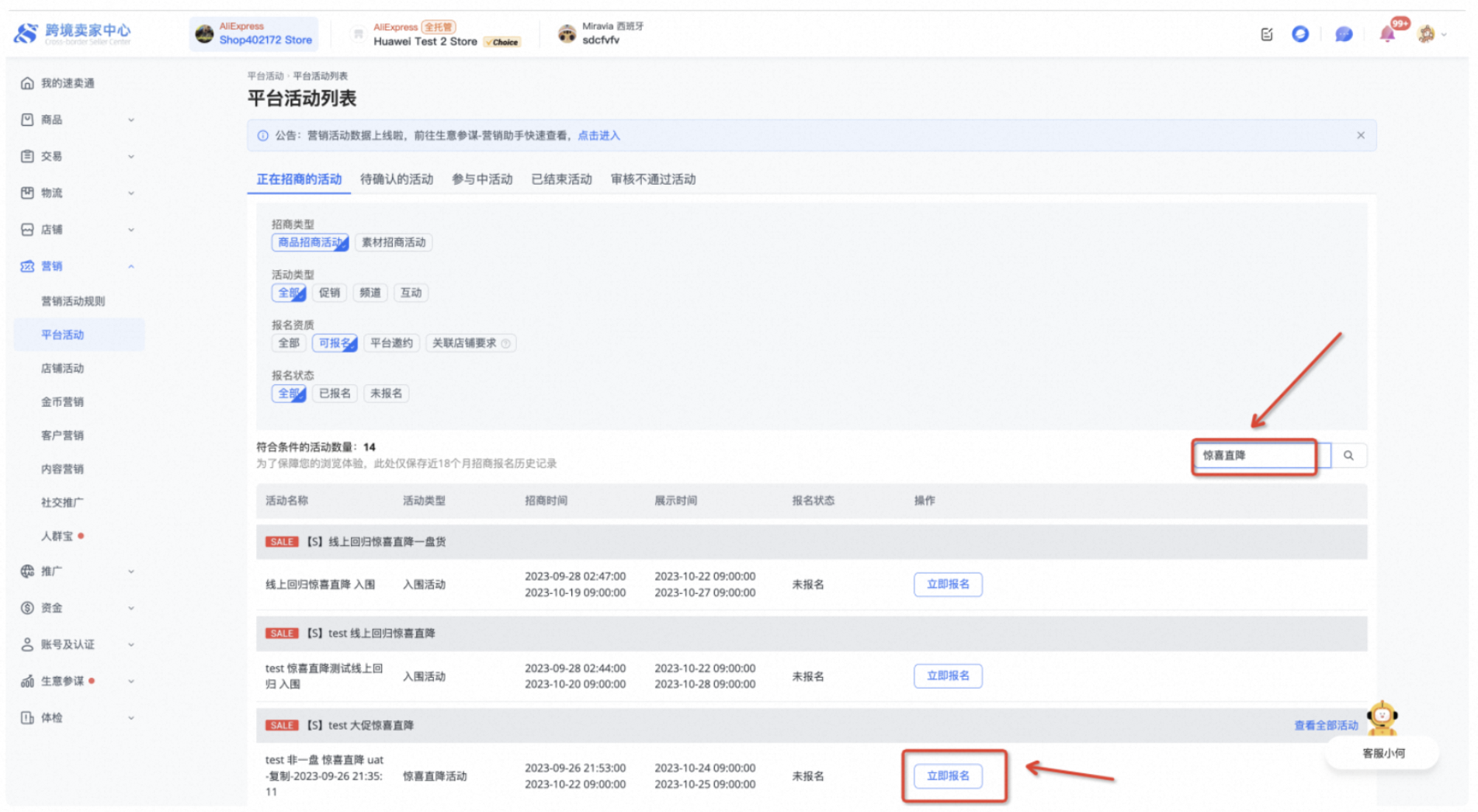 在输入框搜索「惊喜直降活动」 ,找到需要报名的活动 ->点击立即报名