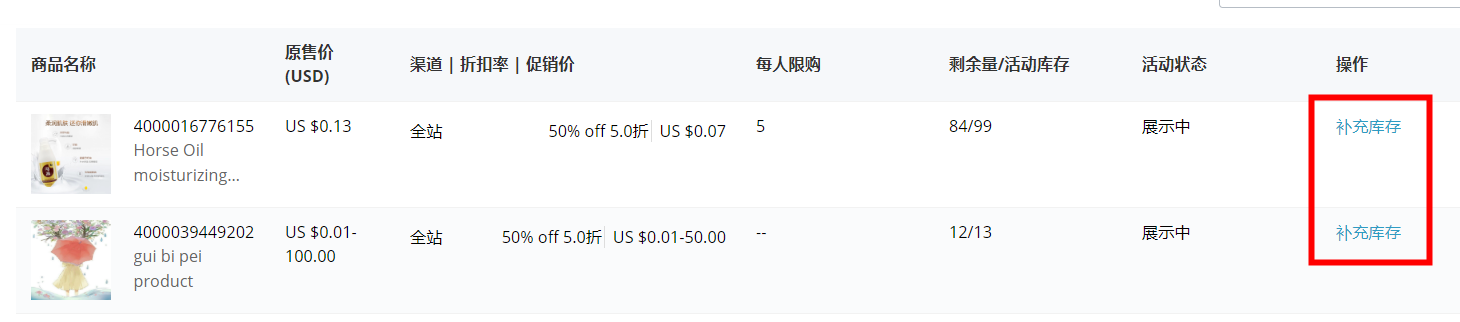 3)其他平台活动需等活动开始后才可以补充库存,未开始状态下无法补充,操作路径: