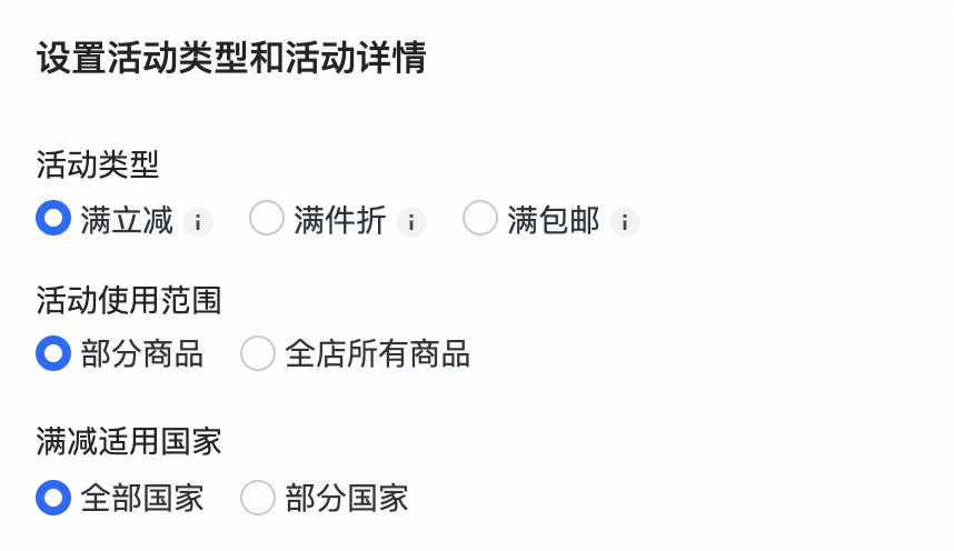 1)活动类型:请根据您的活动目的设置活动类型、适用商品范围与适用国家范围;
