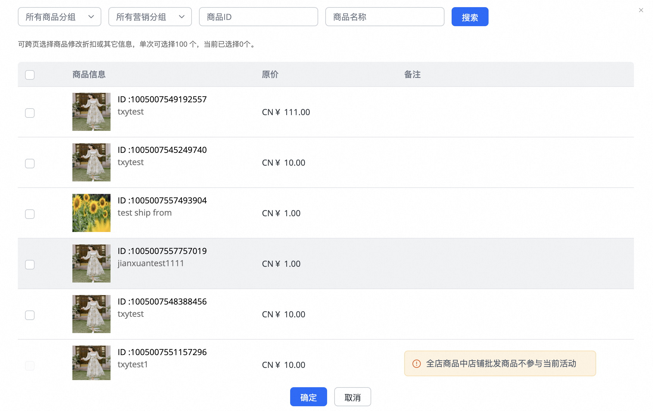 1)方式一:如下图所示可以通过“选择商品”点选商品,单次最多可以选择100商品,选择后点击“确认”即可完成商品添加;