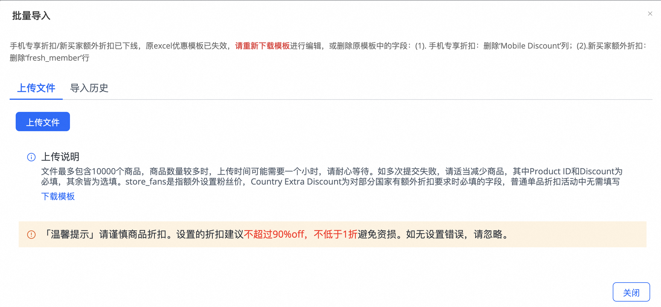 2)方式二:也可以通过批量导入excel导入商品,excel一次最多可以导入10000商品。Excel 批量导入界面如下,先下载模版,在模版文件中提交商品信息,然后上传文件,在上传结果处确认活动商品列表。