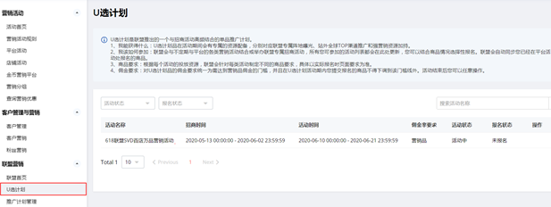 2、联盟商家后台: “U选计划”处自动同步平台已配置同步联盟投放的营销活动列表。您可选择任意活动报名。