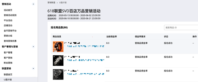 3、商品报名和设佣:点击要报名的活动后选择活动期需联盟投放商品→设置活动期投放佣金。PS:活动期佣金不得退出营销品或下调到低于营销品门槛线外。