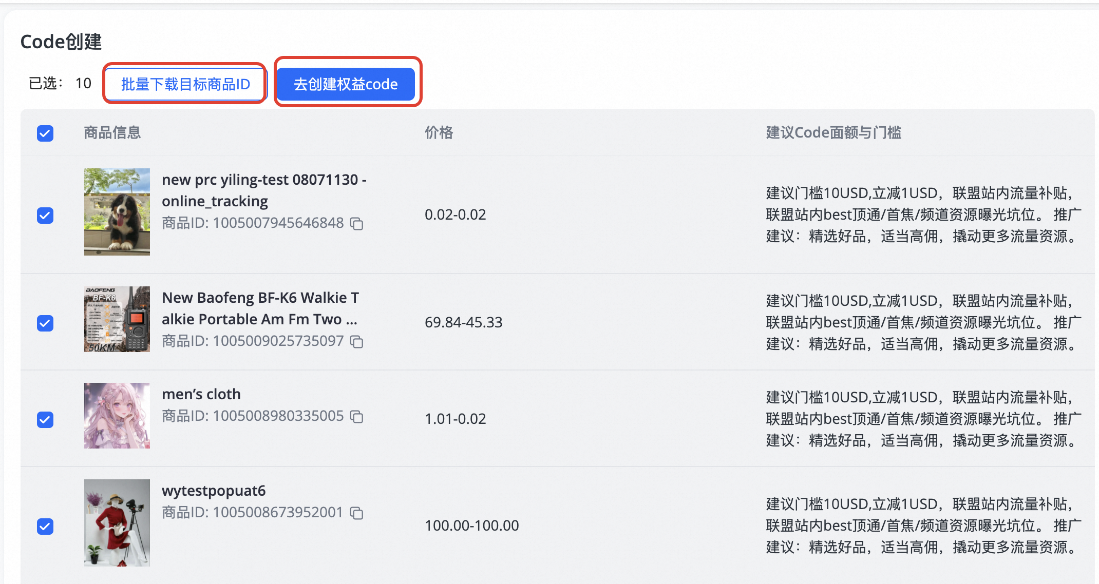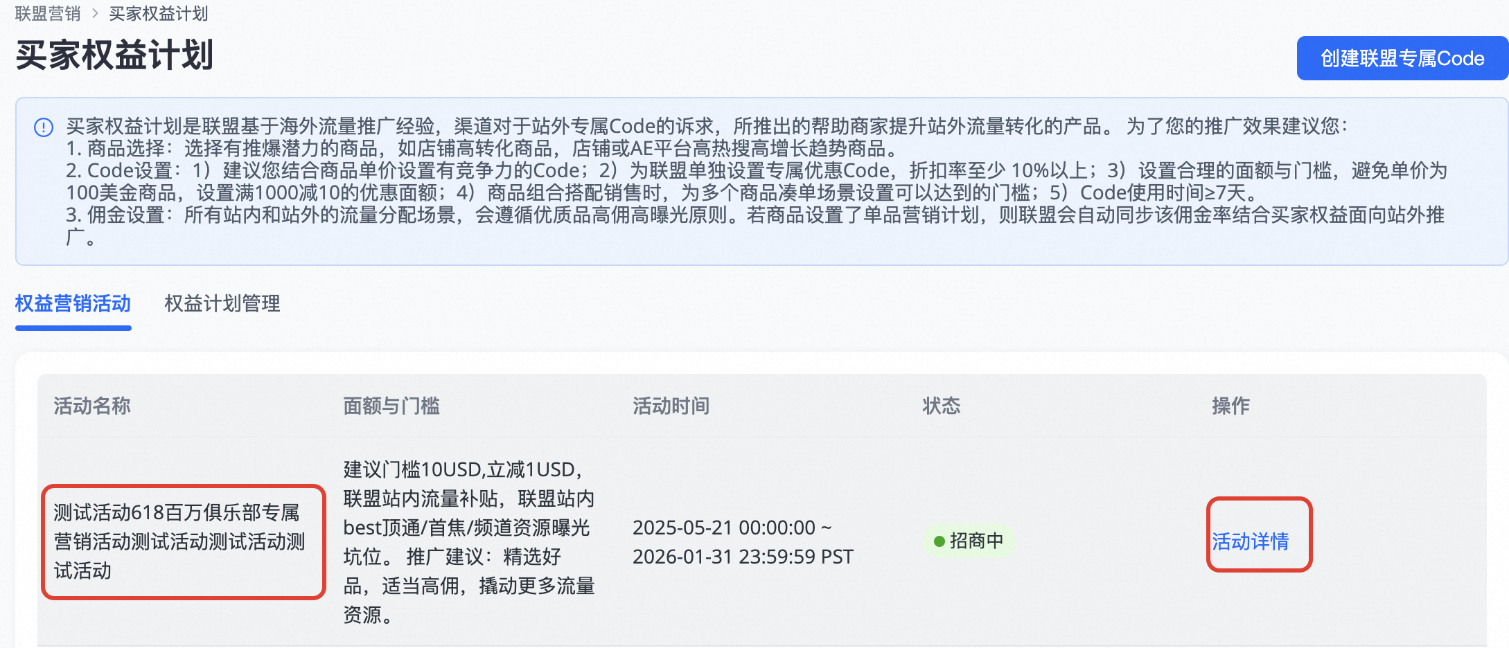 第二步:查看营销活动,并下载建议商品,点击去创建联盟专属code(渠道重点建议商品,其余商品也可以设置)
