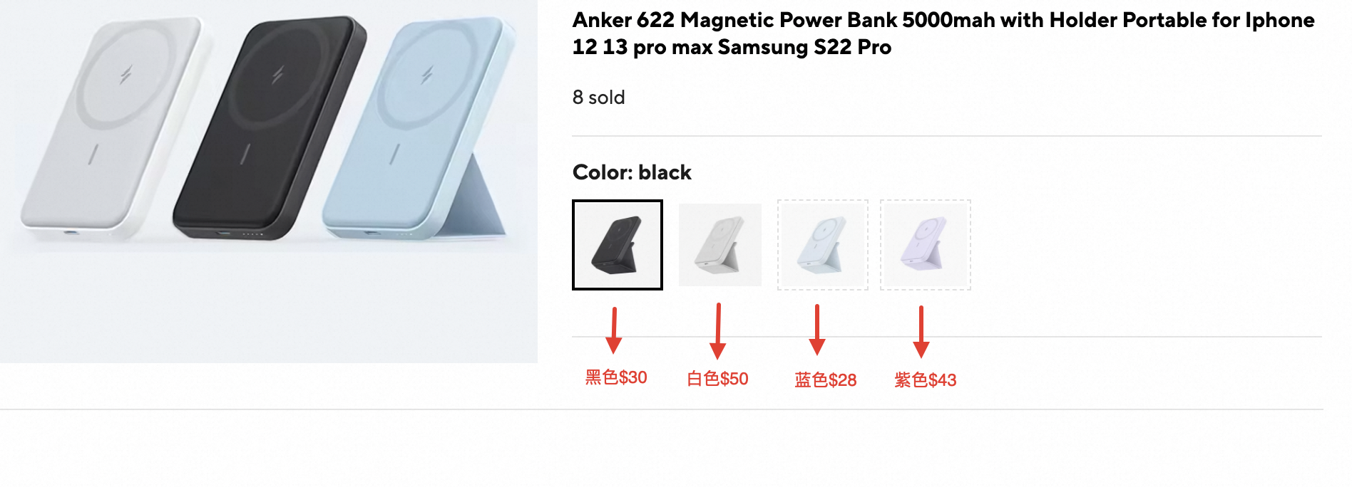 【举个】商品有4个sku,商详情页售价分别为:黑色$30,白色$50,蓝色$28,紫色$43,则最低价sku为$28蓝色,作为运营老手我会这么来设置: