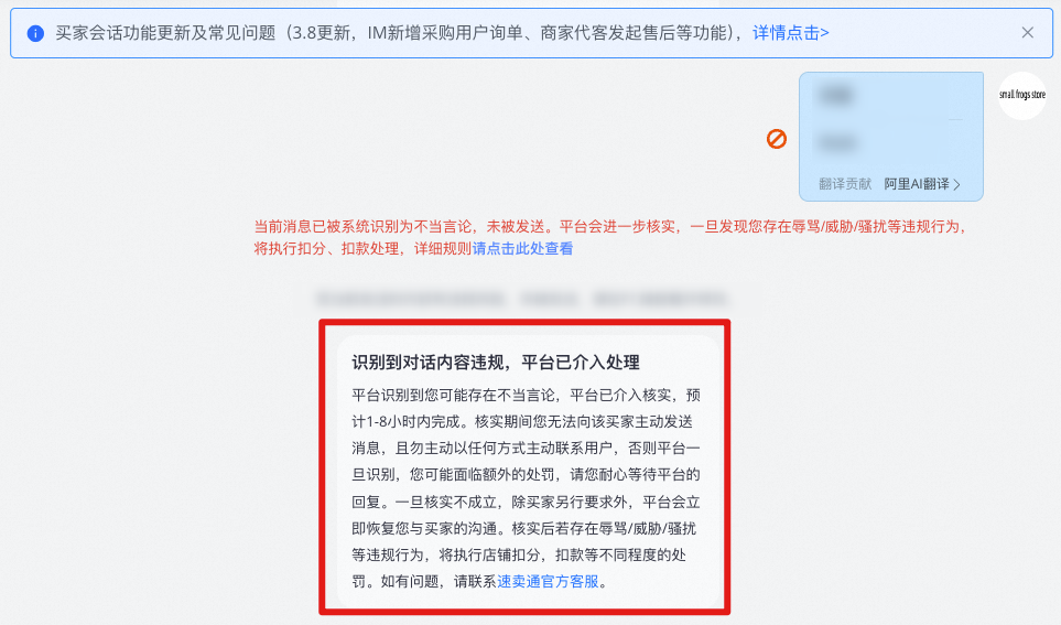 【内容】平台识别到您可能存在不当言论,平台已介入核实,预计1-8小时内完成。核实期间您无法向该买家主动发送消息,且勿主动以任何方式主动联系用户,否则平台一旦识别,您可能面临额外的处罚,请您耐心等待平台的回复。一旦核实不成立,除买家另行要求外,平台会立即恢复您与买家的沟通。核实后若存在辱骂/威胁/骚扰等违规行为,将执行店铺扣分,扣款等不同程度的处罚。如有问题,请联系速卖通官方客服。