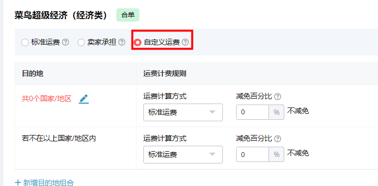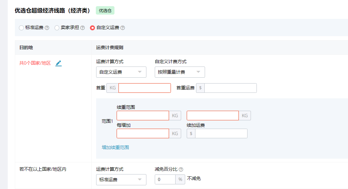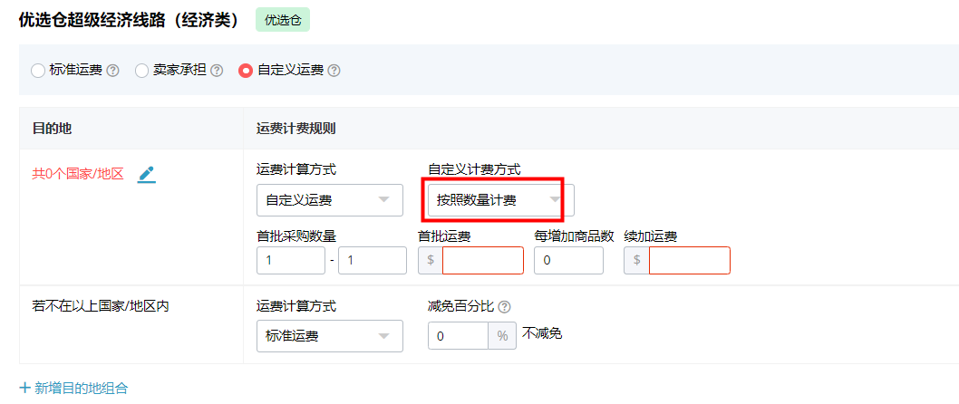 点击进入后,选择国家或地区,设置运费类型选择【自定义运费】,可以选择按照重量设置或者按照数量设置,结合您实际想要的操作;