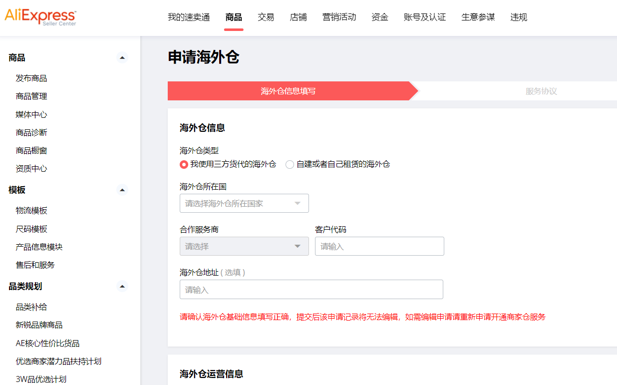 如您要申请第三方仓,您可以根据页面提示提交申请资料;