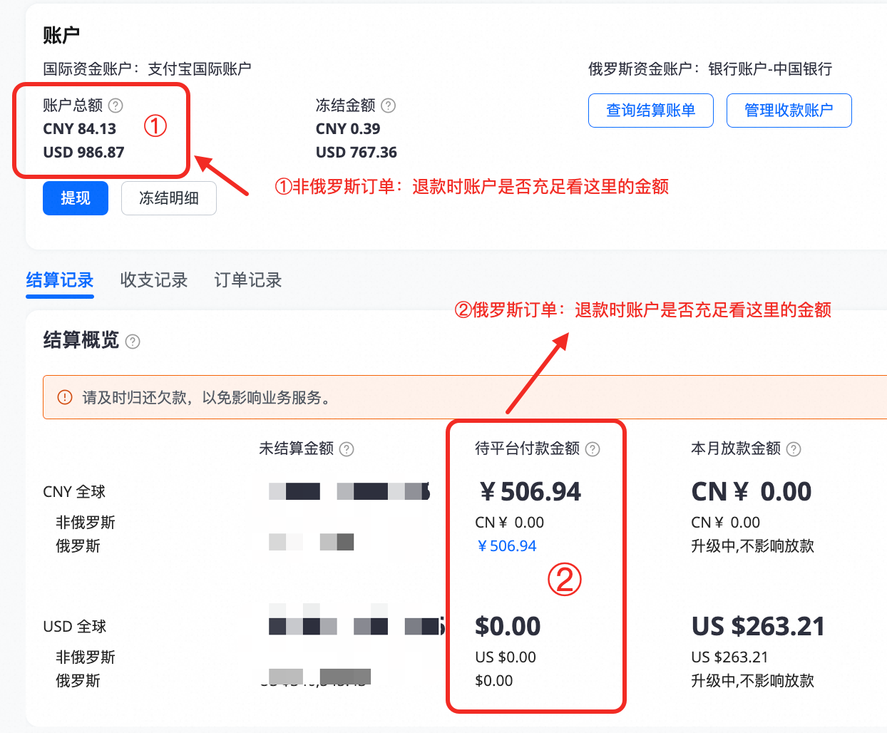 非俄罗斯订单:退款时看国际支付宝的账户余额是否充足;
