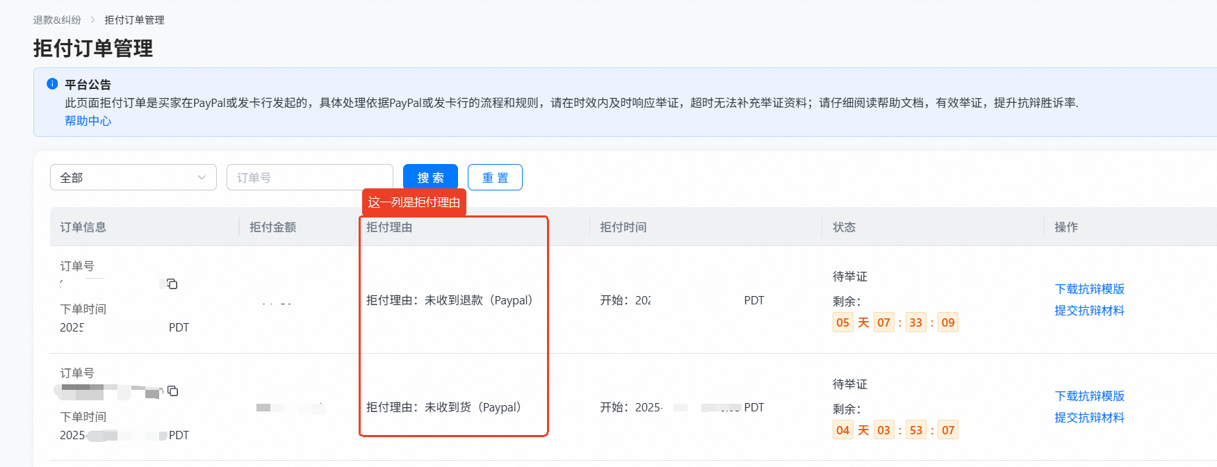 1.商家工作台-交易-【退款&纠纷】页面,点击“待举证的拒付订单”,找到相关订单
