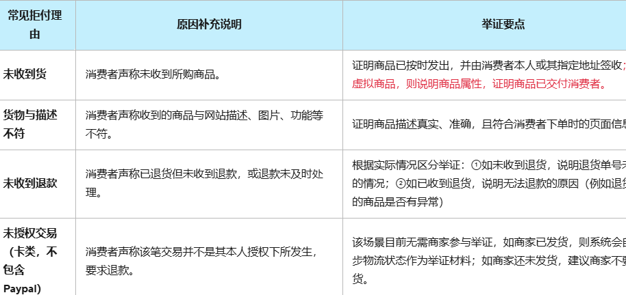 2.常见拒付原因的解释说明和举证要点说明