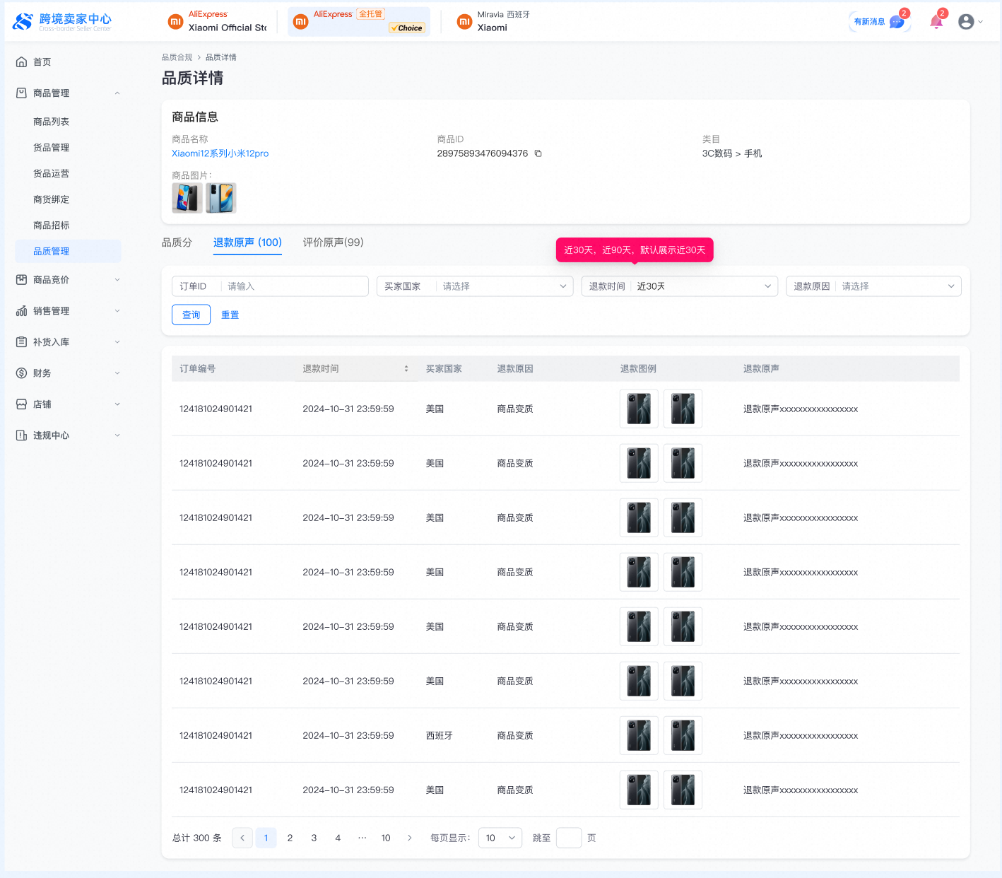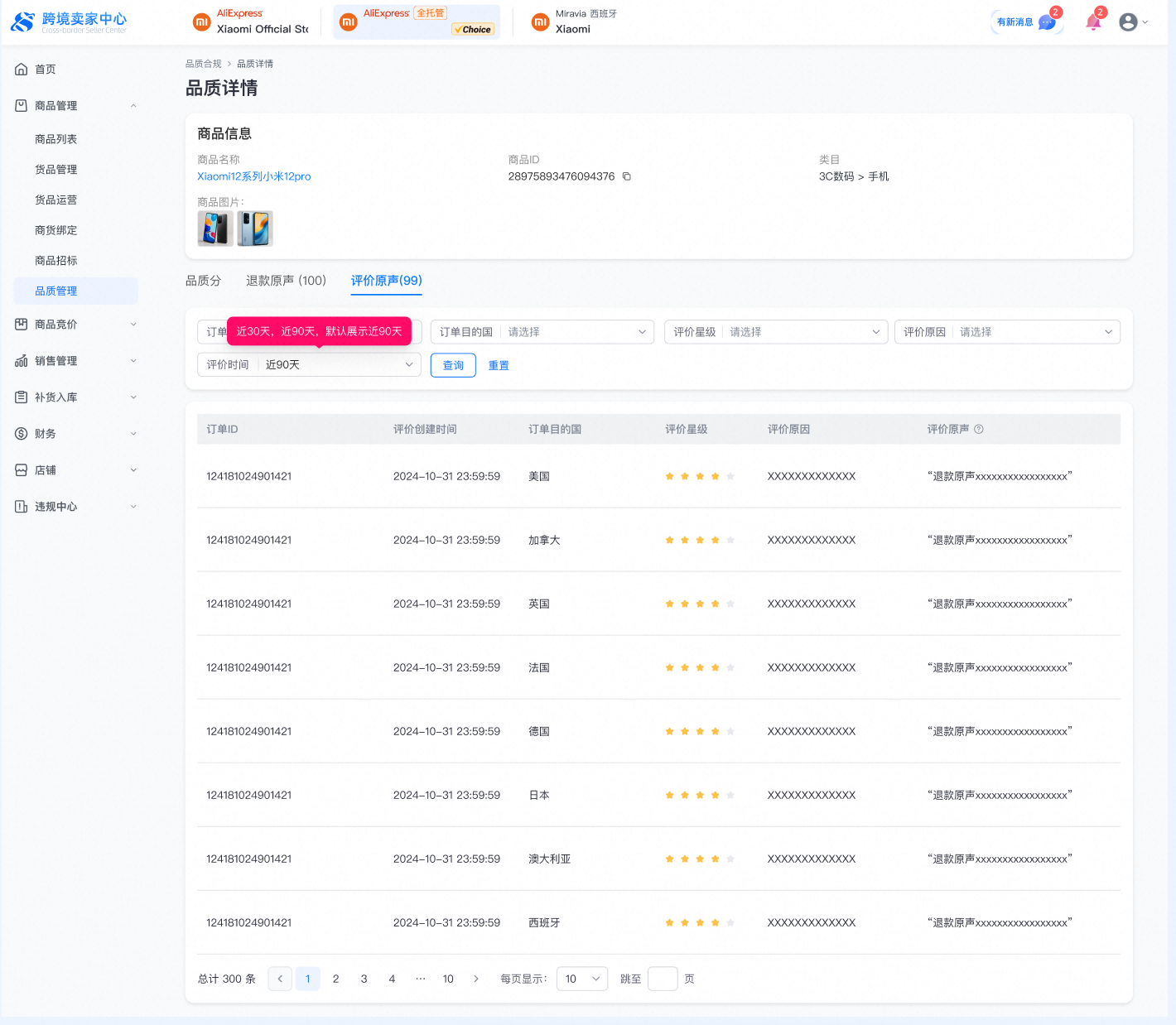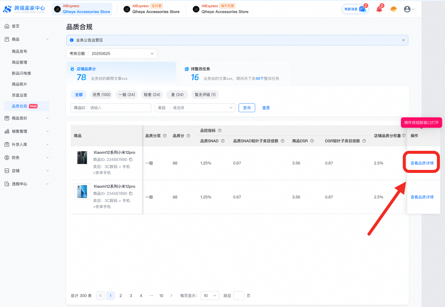 1、查看路径:【速卖通跨境卖家中心】>【商品】>【品质合规】>【店铺品质分】查看商品品质分数据。页面默认展示最新考核周期,点击下拉框,可切换不同周期查看品质等级。