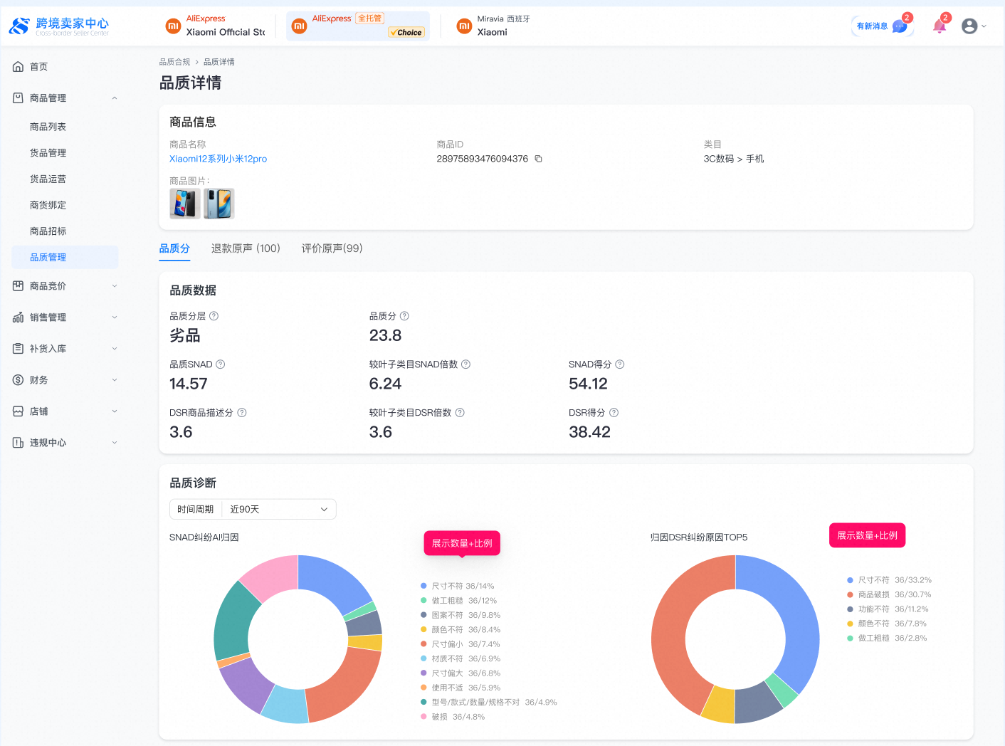 点击右侧查看品质详情,包含商品品质分、品质诊断、用户退款原声、用户评价原声。商家可参考商品品质详情,定位用户体验核心问题,提升商品品质。