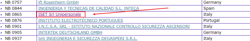 点击字母“I”,在列表查找找到“ISET Srl Unipersonale”,如果找不到,可能该认证机构并不在CE认证机构名单内,证书也会是无效的