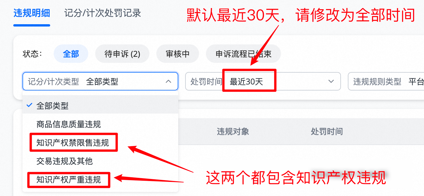 2、在「记分/计次类型」中选择「知识产权禁限售违规」可以看到「知识产权一般侵权」的违规记录。