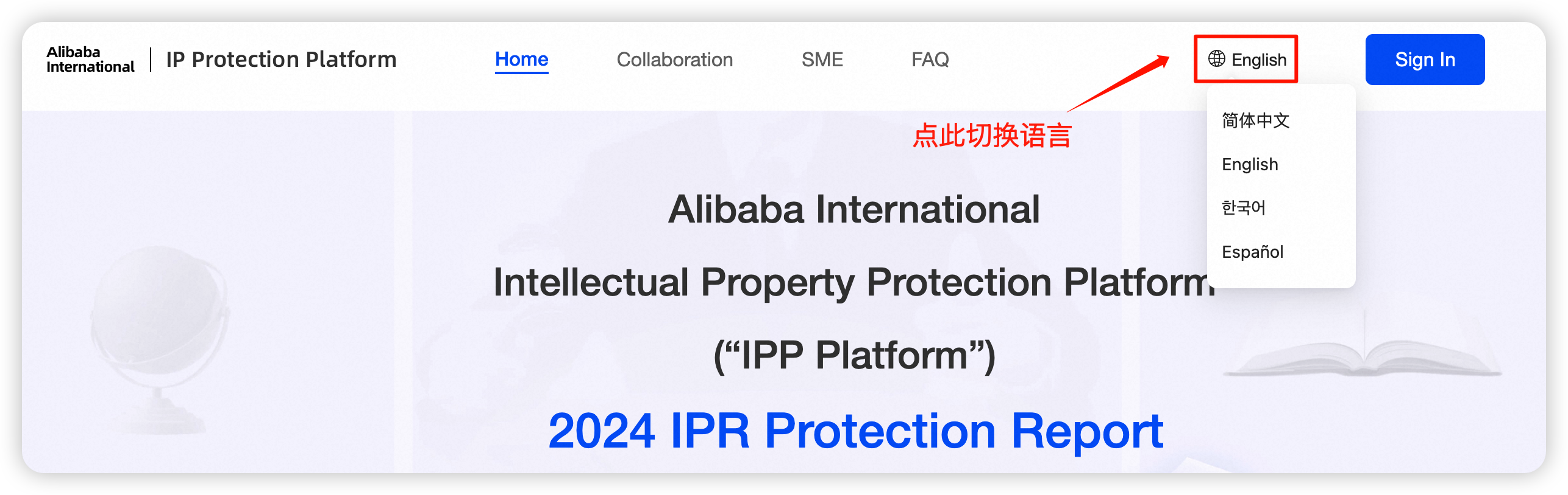 知识产权保护平台→点此直达,页面默认可能是英语/English,点击右上角的「English」按钮即可切换到「简体中文」