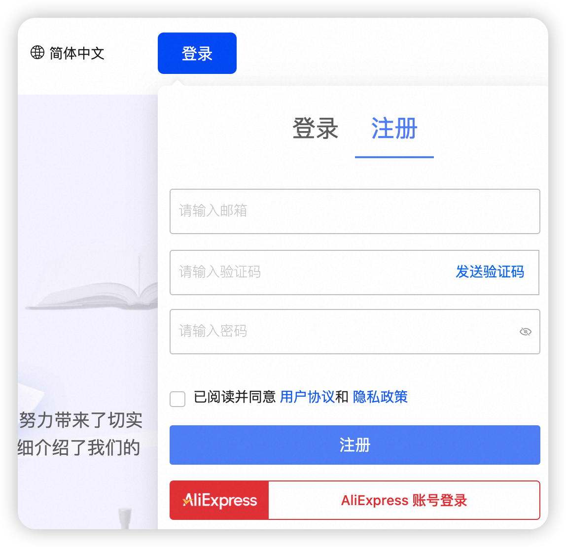 同时,该平台支持速卖通账号登录,您也可以点击「AliExpress账号登录」