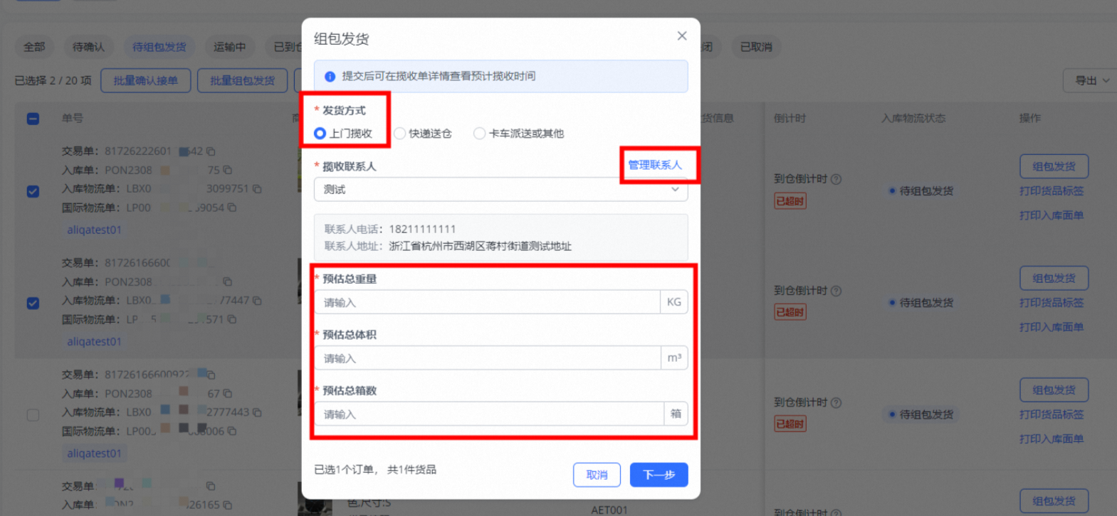 选择上门揽收时,编辑填写联系人(含发货地址)信息,预估总重量、预估总体积、预估总箱数信息,点击下一步