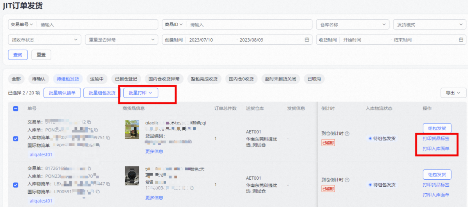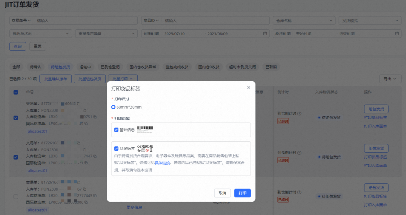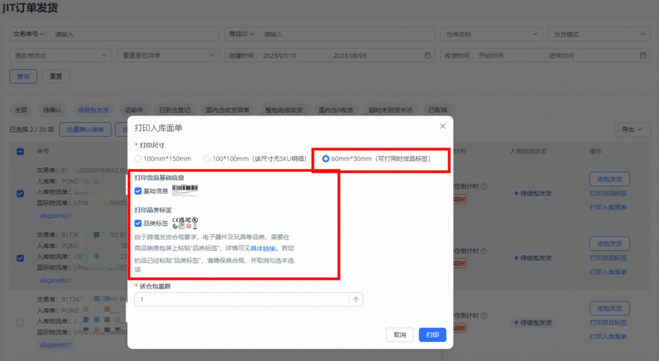 确认接单后,点击打印【货品标签】及【入库面单】,同时支持批量操作