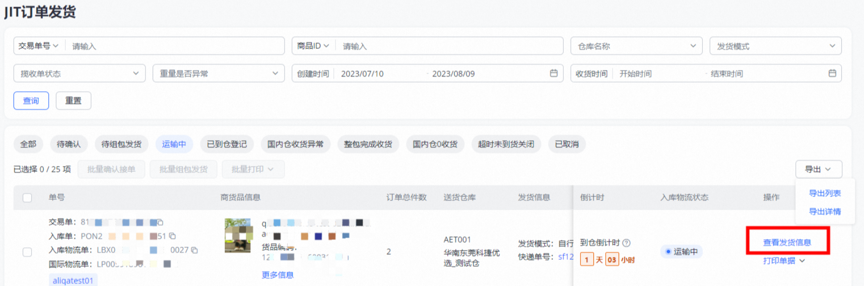 进入JIT发货界面,进行货品、面单打印,组包预约发货