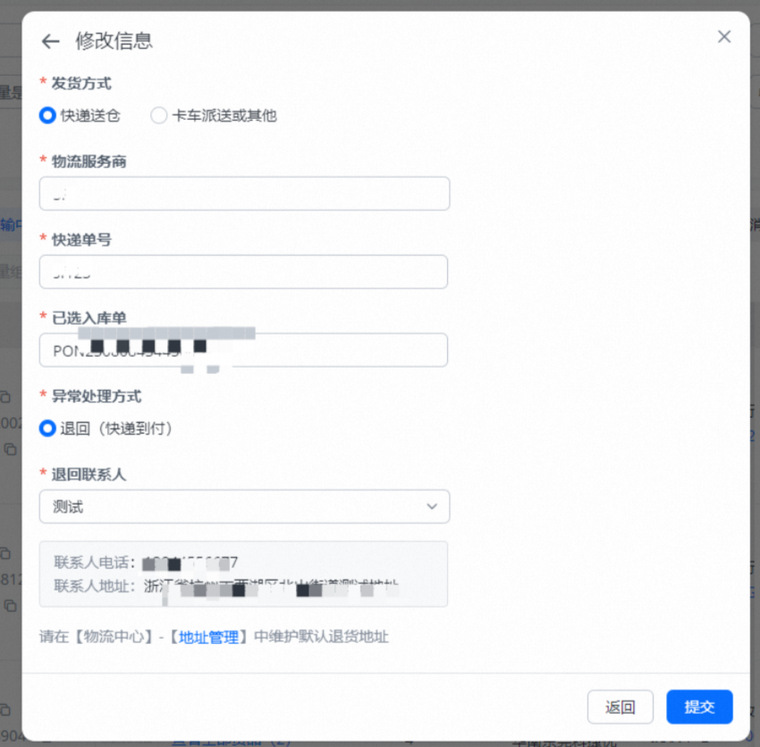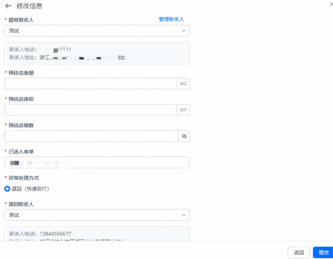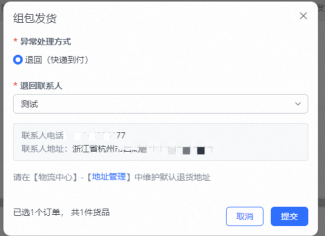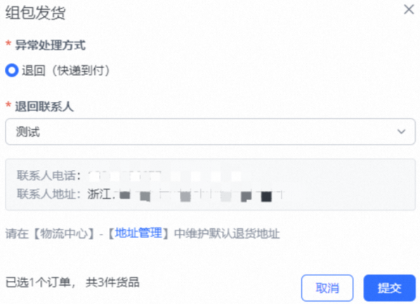 选择异常处理方式,编辑退回联系人(含地址),点击提交
