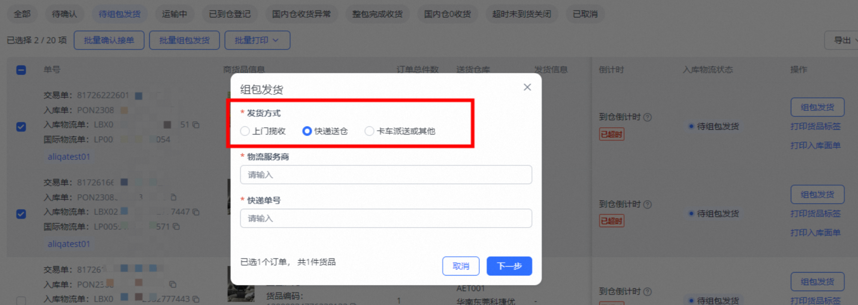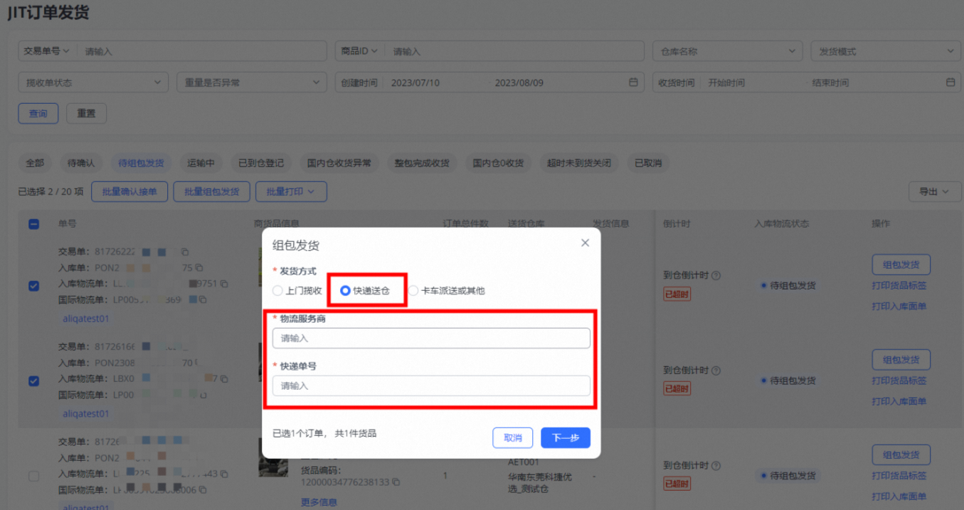 选择快递送仓时,填写物流服务商及快递单号信息,点击下一步