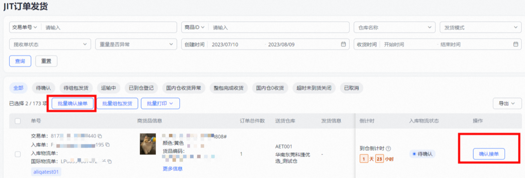 针对发货订单,点击【确认接单】,同时商家也可操作批量确认接单
