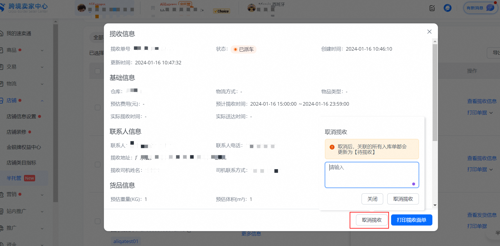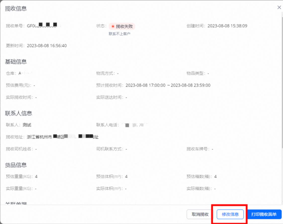 发货之后,揽收方式需要更改发货信息时,可以点击【查看揽收信息】进行更改