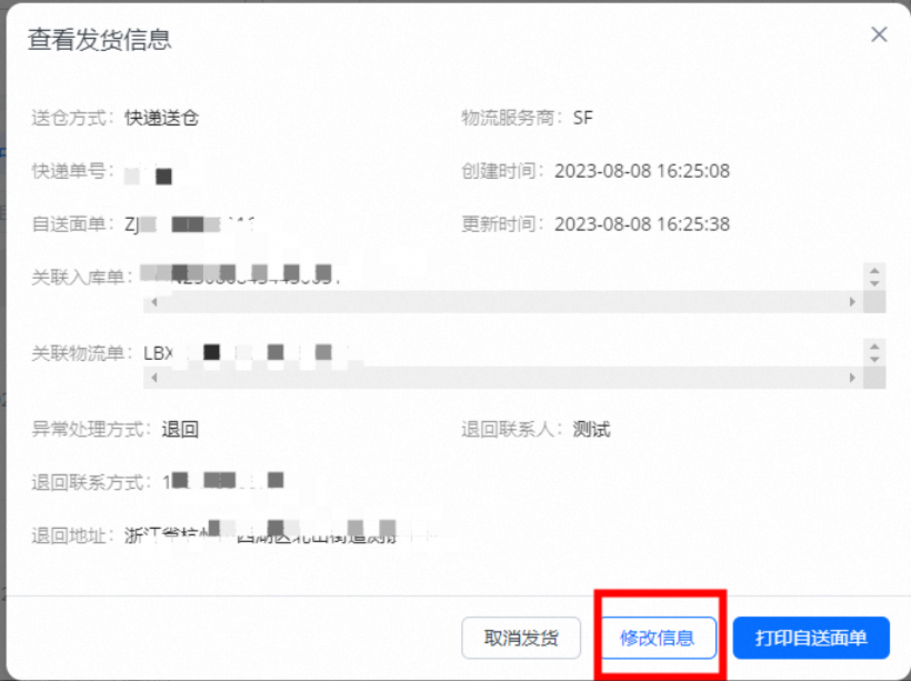 发货之后,自寄/自送方式需要更改发货信息时,可以点击【查看发货信息】进行更改