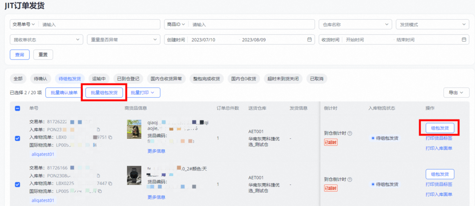 操作【组包发货】,支持批量操作