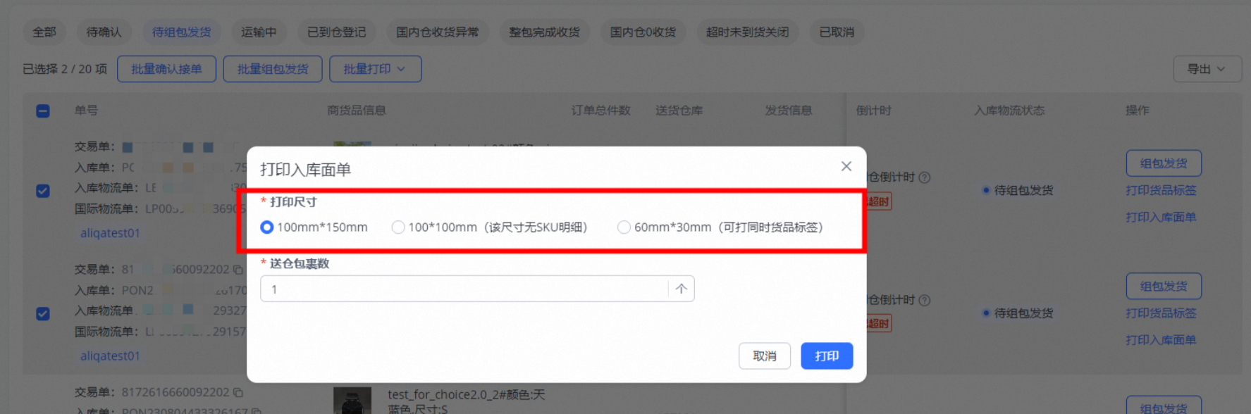 点击打印【入库面单】,可以选择不同尺寸的面单