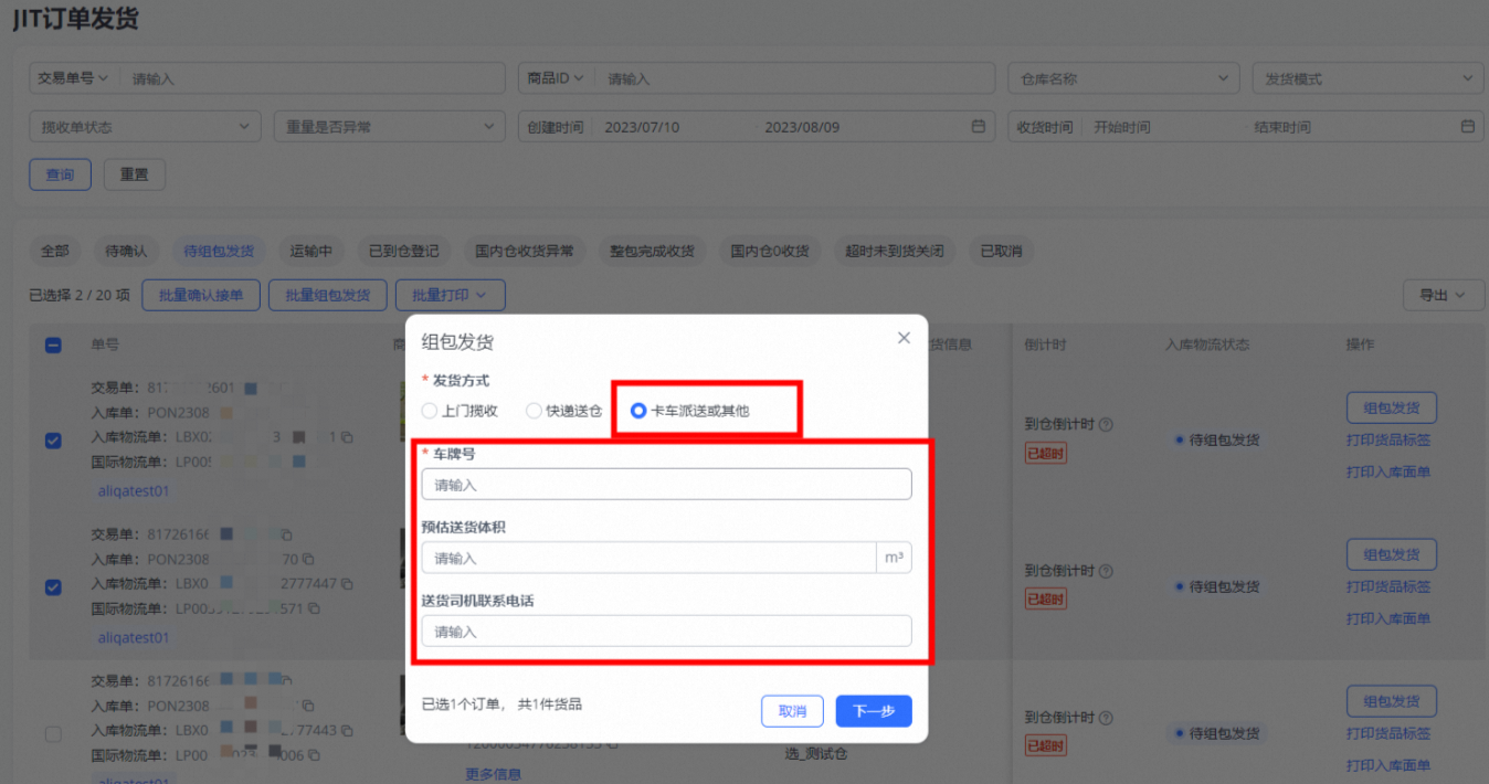 选择卡车派送或其他时,填写车牌号等信息,点击下一步