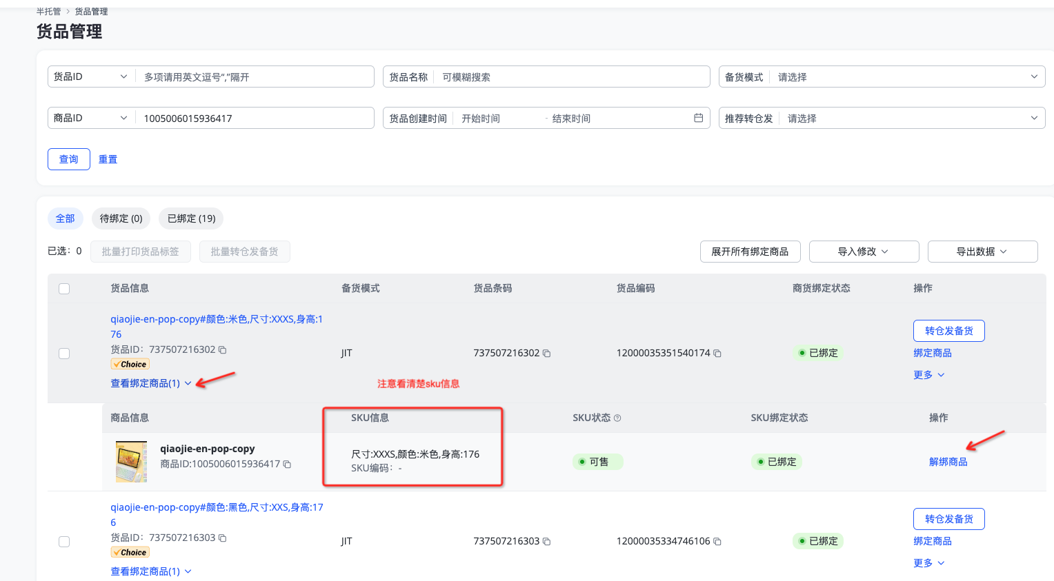 到「半托管-货品管理页面操作解绑」