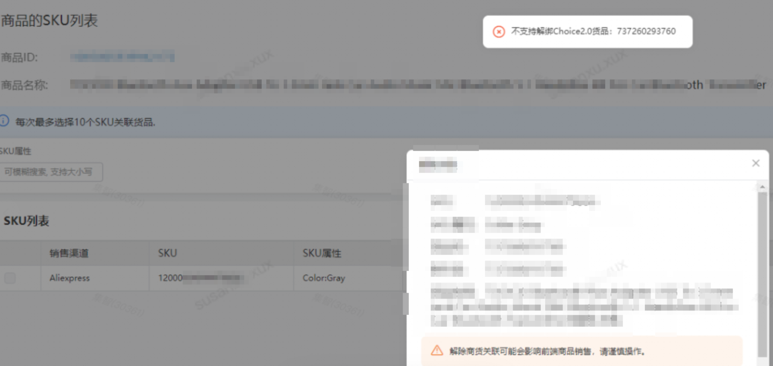 因为该商品下多个SKU绑到了同一个货品上,这个在系统上不支持。