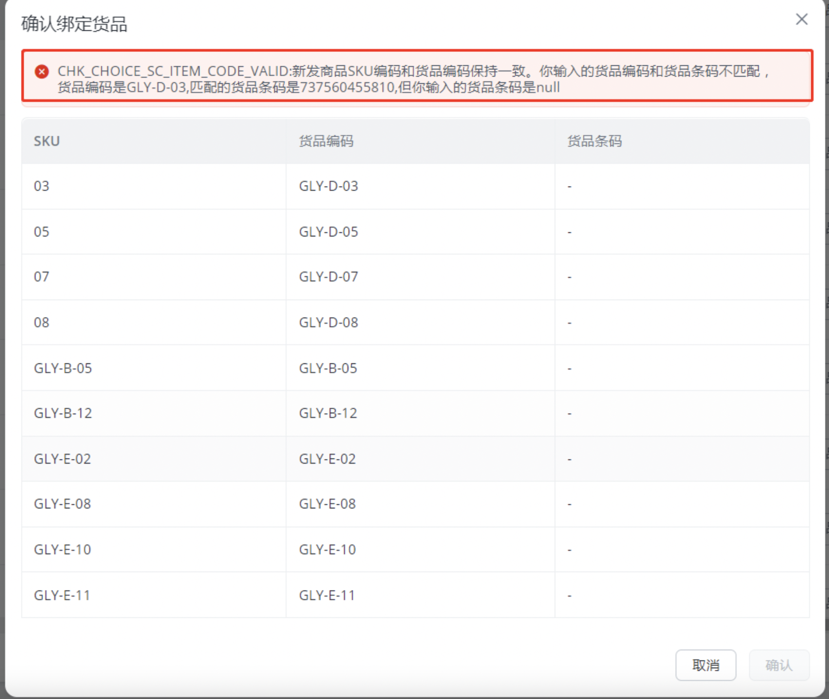 GLY-D-3这个货品编码对应的条码是 7xxxx,但是商家填的时候删掉了条码。