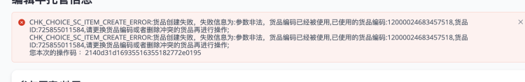 现象:条码已经被使用,已使用的货品id:737466288900.条码:12000032763508798#请修改当前货品的条码或者是订正已占用条码的货品;