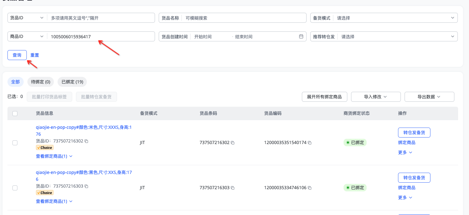 现象描述:货品条码查到的编码与填写不一致