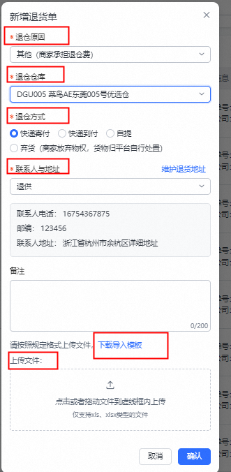 按商家需求退供的相关信息填写退仓原因、仓库、退供收货联系人和地址,并下载模版后上传文件并确认,即可完成退供单创建。---注意:选择退供仓库后,才会有“退仓方式”选项,在此商家可以选择是自提、寄付、到付或者弃货。